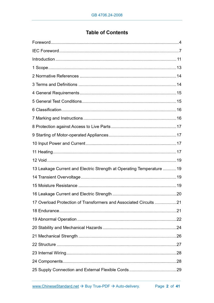 Foreword... 4 IEC Foreword... 7 Introduction... 11 1 Scope... 13 2 Normative References... 14 3 Terms and Definitions... 14 4 General Requirements... 15 5 General Test Conditions... 15 6 Classification... 16 7 Marking and Instructions... 16 8 Protection against Access to Live Parts... 17 9 Starting of Motor-operated Appliances... 17 10 Input Power and Current... 17 11 Heating... 17 12 Void... 19 13 Leakage Current and Electric Strength at Operating Temperature... 19 14 Transient Overvoltage... 19 15 Moisture Resistance... 19 16 Leakage Current and Electric Strength... 20 17 Overload Protection of Transformers and Associated Circuits... 21 18 Endurance... 21 19 Abnormal Operation... 22 20 Stability and Mechanical Hazards... 24 21 Mechanical Strength... 26 22 Structure... 27 23 Internal Wiring... 28 24 Components... 28 25 Supply Connection and External Flexible Cords... 29 26 Terminals for External Conductors... 29 27 Measures for Earthing... 29 28 Screws and Connections... 29 29 Clearance, Creep Distance and Solid Insulation... 29 30 Resistance to Heat and Fire... 29 31 Resistance to Rusting... 30 32 Radiation, Toxicity and Similar Hazards... 30 Appendix AA (normative) Detergent and Rinsing Agent... 31 Appendix BB (normative) Ageing Test for Elastomeric Parts... 33 Appendix CC (normative) Detergent-free Electrolyte Washing Machines... 35 Appendix DD (normative) Washing Machines with a Power-driven Wringer.. 39 Bibliography... 41Foreword