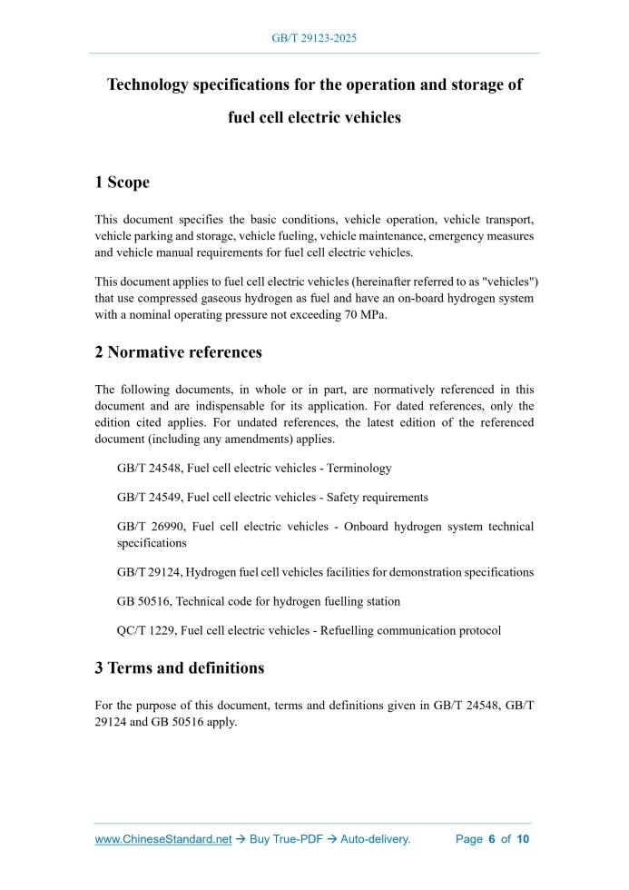 GB NATIONAL STANDARD OF THE PEOPLE’S REPUBLIC OF CHINA ICS 43.020 CCS T 04 Replacing GB/T 29123-2012 Technology specifications for the operation and storage of fuel cell electric vehicles Issued on: AUGUST 01, 2025 Implemented on: FEBRUARY 01, 2026 Issued by. State Administration for Market Regulation; Standardization Administration of the People’s Republic of China.