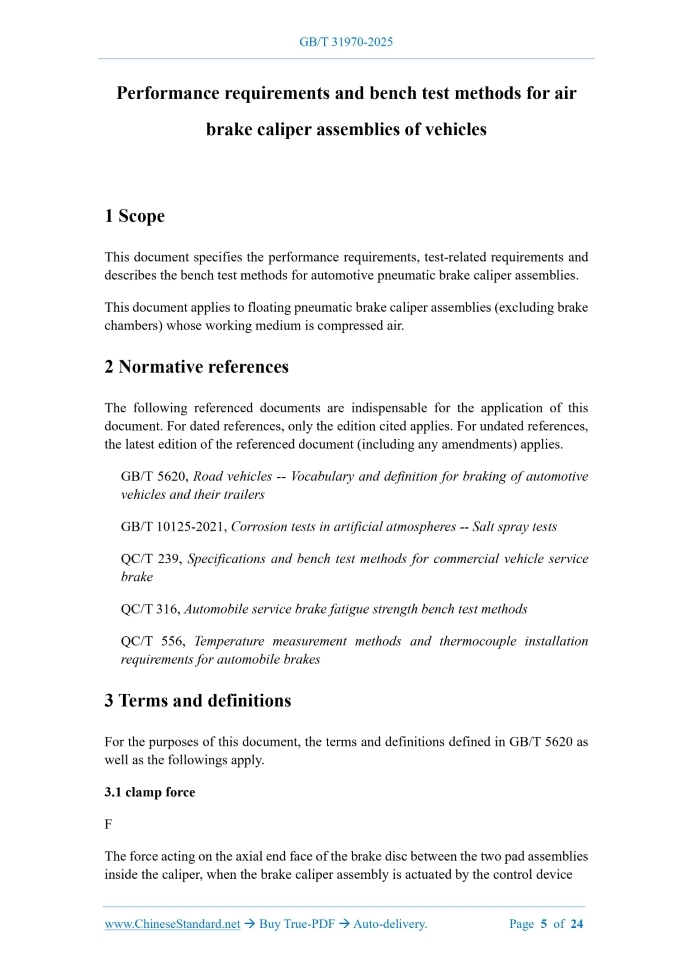 GB NATIONAL STANDARD OF THE PEOPLE’S REPUBLIC OF CHINA ICS 43.040.40 CCS T 24 Replacing GB/T 31970-2015 Performance requirements and bench test methods for air brake caliper assemblies of vehicles Issued on: AUGUST 29, 2025 Implemented on: MARCH 01, 2026 Issued by. State Administration for Market Regulation; Standardization Administration of the People's Republic of China.