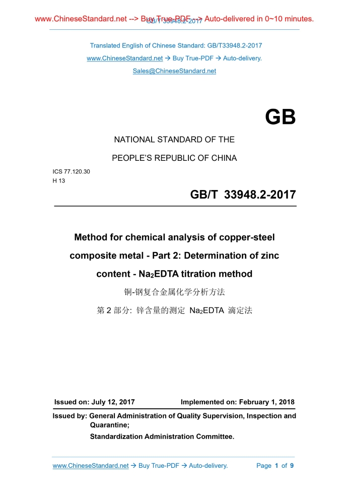 GB NATIONAL STANDARD OF THE PEOPLE’S REPUBLIC OF CHINA ICS 77.120.30 H 13 Method for chemical analysis of copper-steel composite metal - Part 2. Determination of zinc content - Na2EDTA titration method Issued on: JULY 12, 2017 Implemented on: FEBRUARY 1, 2018 Issued by. General Administration of Quality Supervision, Inspection and Quarantine; Standardization Administration Committee.