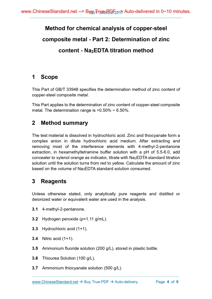 This Part of GB/T 33948 specifies the determination method of zinc content of copper-steel composite metal. This Part applies to the determination of zinc content of copper-steel composite metal. The determination range is >0.50% ~ 6.50%.2 Method summary