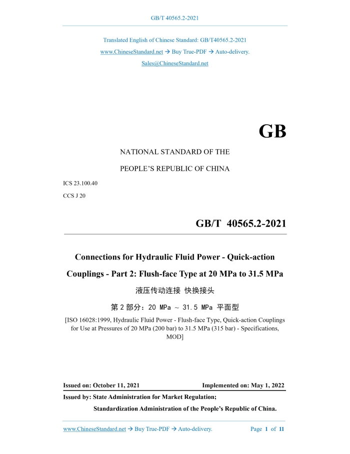 GB/T 40565.2-2021: Connections for hydraulic fluid power. Quick-action couplings - Part 2: Flush-face type at 20 MPa to 31.5 Mpa