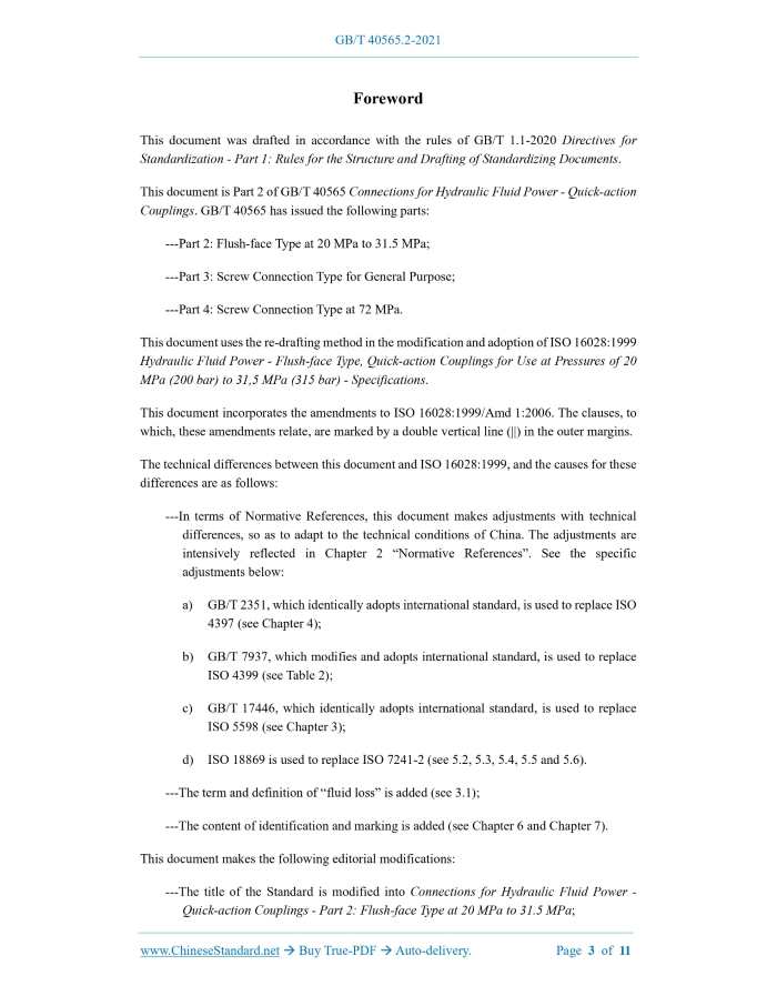 This document was drafted in accordance with the rules of GB/T 1.1-2020 Directives for Standardization - Part 1.Rules for the Structure and Drafting of Standardizing Documents. This document is Part 2 of GB/T 40565 Connections for Hydraulic Fluid Power - Quick-action Couplings. GB/T 40565 has issued the following parts. ---Part 2.Flush-face Type at 20 MPa to 31.5 MPa; ---Part 3.Screw Connection Type for General Purpose; ---Part 4.Screw Connection Type at 72 MPa. This document uses the re-drafting method in the modification and adoption of ISO 16028.1999 Hydraulic Fluid Power - Flush-face Type, Quick-action Couplings for Use at Pressures of 20 MPa (200 bar) to 31,5 MPa (315 bar) - Specifications. This document incorporates the amendments to ISO 16028.1999/Amd 1.2006.The clauses, to which, these amendments relate, are marked by a double vertical line (||) in the outer margins. The technical differences between this document and ISO 16028.1999, and the causes for these differences are as follows. ---In terms of Normative References, this document makes adjustments with technical differences, so as to adapt to the technical conditions of China. The adjustments are intensively reflected in Chapter 2 “Normative References”. See the specific adjustments below. a) GB/T 2351, which identically adopts international standard, is used to replace ISO 4397 (see Chapter 4); b) GB/T 7937, which modifies and adopts international standard, is used to replace ISO 4399 (see Table 2); c) GB/T 17446, which identically adopts international standard, is used to replace ISO 5598 (see Chapter 3); d) ISO 18869 is used to replace ISO 7241-2 (see 5.2, 5.3, 5.4, 5.5 and 5.6). ---The term and definition of “fluid loss” is added (see 3.1); ---The content of identification and marking is added (see Chapter 6 and Chapter 7). This document makes the following editorial modifications. ---The title of the Standard is modified into Connections for Hydraulic Fluid Power - Quick-action Couplings - Part 2.Flush-face Type at 20 MPa to 31.5 MPa; Connections for Hydraulic Fluid Power - Quick-action Couplings - Part 2.Flush-face Type at 20 MPa to 31.5 MPa1 Scope
