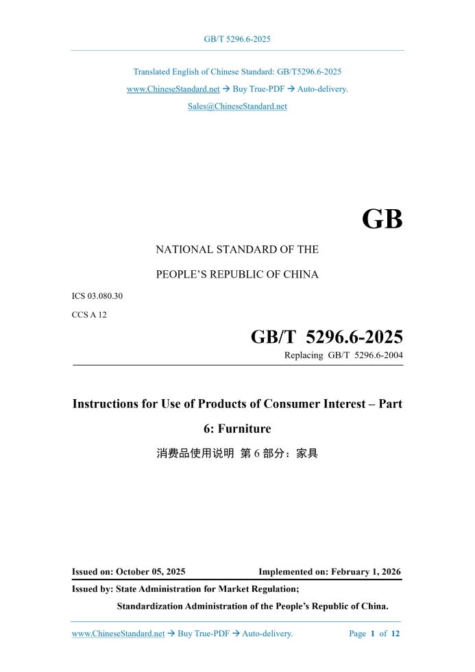---This is an excerpt. Full copy of true-PDF in English version (including equations, symbols, images, flow-chart, tables, and figures etc.), auto-downloaded/delivered in 9 seconds, can be purchased online: https://www.ChineseStandard.net/PDF.aspx/GBT5296.6-2025GB NATIONAL STANDARD OF THE PEOPLE’S REPUBLIC OF CHINA ICS 03.080.30 CCS A 12 Replacing GB/T 5296.6-2004 Instructions for Use of Products of Consumer Interest – Part 6.Furniture Issued on: OCTOBER 05, 2025 Implemented on: FEBRUARY 1, 2026 Issued by. State Administration for Market Regulation; Standardization Administration of the People’s Republic of China.