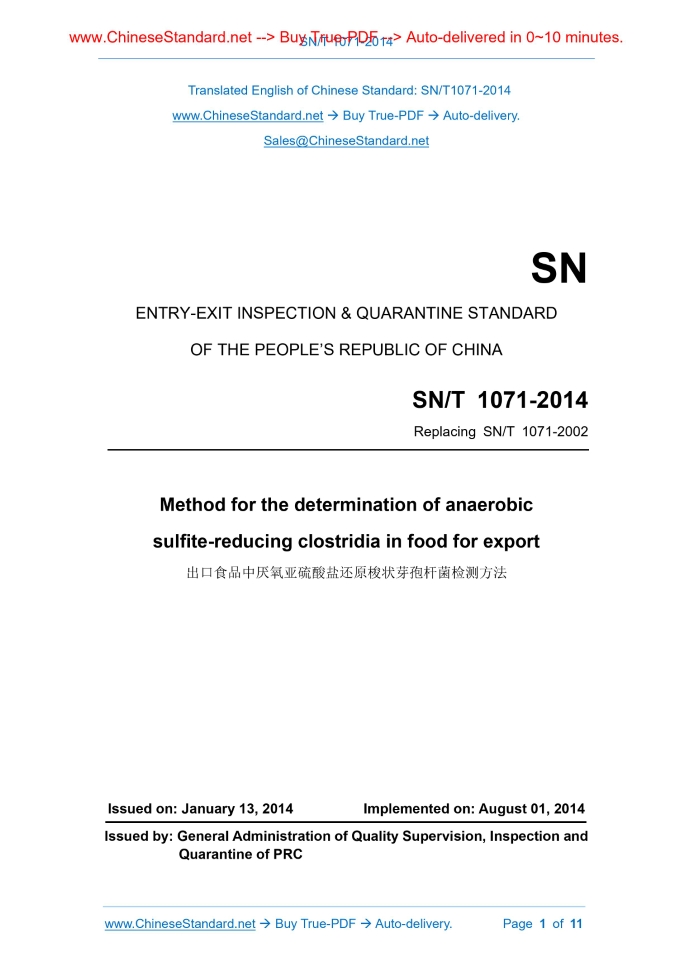 SN ENTRY-EXIT INSPECTION & QUARANTINE STANDARD Replacing SN/T 1071-2002 Method for the determination of anaerobic sulfite-reducing clostridia in food for export Issued on: JANUARY 13, 2014 Implemented on: AUGUST 01, 2014 Issued by. General Administration of Quality Supervision, Inspection and Quarantine of PRC