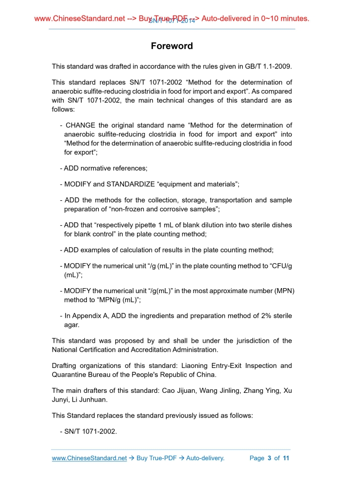 This standard was drafted in accordance with the rules given in GB/T 1.1-2009. This standard replaces SN/T 1071-2002 “Method for the determination of anaerobic sulfite-reducing clostridia in food for import and export”. As compared with SN/T 1071-2002, the main technical changes of this standard are as follows. - CHANGE the original standard name “Method for the determination of anaerobic sulfite-reducing clostridia in food for import and export” into “Method for the determination of anaerobic sulfite-reducing clostridia in food for export”; - ADD normative references; - MODIFY and STANDARDIZE “equipment and materials”; - ADD the methods for the collection, storage, transportation and sample preparation of “non-frozen and corrosive samples”; - ADD that “respectively pipette 1 mL of blank dilution into two sterile dishes for blank control” in the plate counting method; - ADD examples of calculation of results in the plate counting method; - MODIFY the numerical unit “/g (mL)” in the plate counting method to “CFU/g (mL)”; - MODIFY the numerical unit “/g(mL)” in the most approximate number (MPN) method to “MPN/g (mL)”; - In Appendix A, ADD the ingredients and preparation method of 2% sterile agar. This standard was proposed by and shall be under the jurisdiction of the National Certification and Accreditation Administration. Drafting organizations of this standard. Liaoning Entry-Exit Inspection and Quarantine Bureau of the People's Republic of China. The main drafters of this standard. Cao Jijuan, Wang Jinling, Zhang Ying, Xu Junyi, Li Junhuan. This Standard replaces the standard previously issued as follows. - SN/T 1071-2002. Method for the determination of anaerobic sulfite-reducing clostridia in food for export1 Scope