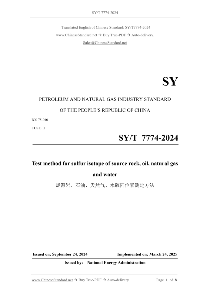 SY PETROLEUM AND NATURAL GAS INDUSTRY STANDARD ICS 75-010 CCS E 11 Test method for sulfur isotope of source rock, oil, natural gas and water Issued on: SEPTEMBER 24, 2024 Implemented on: MARCH 24, 2025 Issued by. National Energy Administration