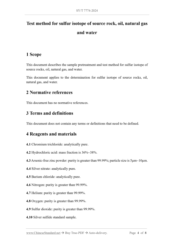 This document describes the sample pretreatment and test method for sulfur isotope of source rocks, oil, natural gas, and water. This document applies to the determination for sulfur isotope of source rocks, oil, natural gas, and water.2 Normative references