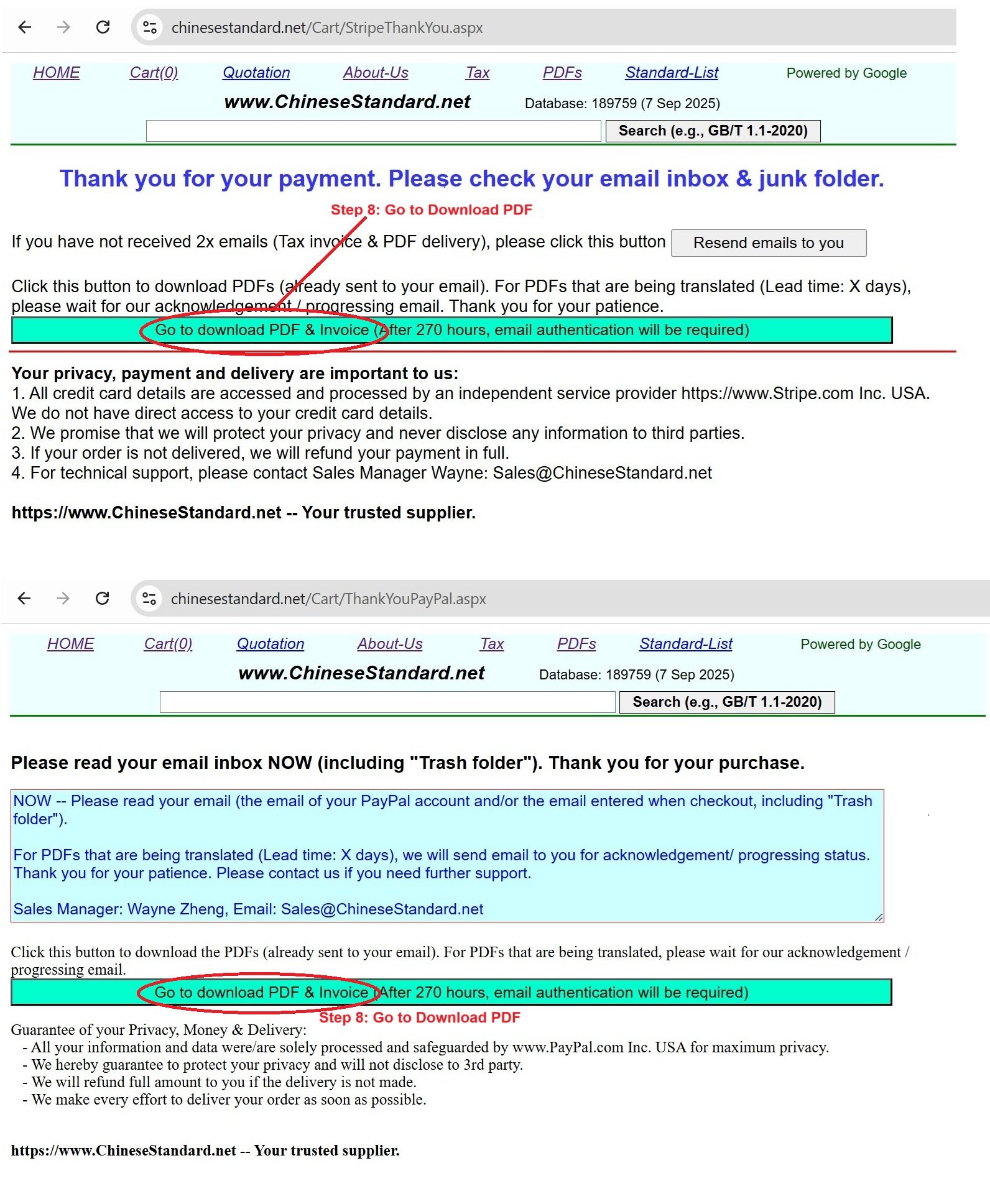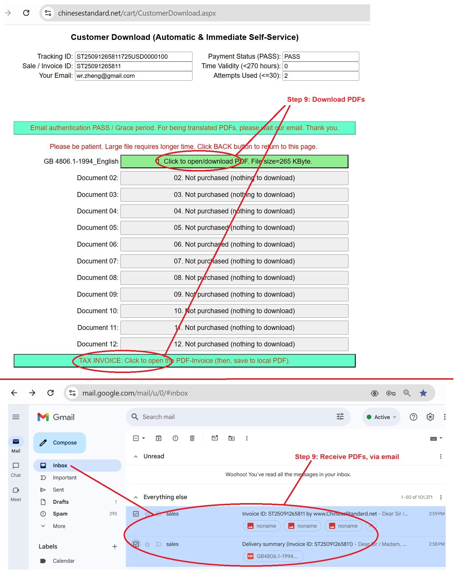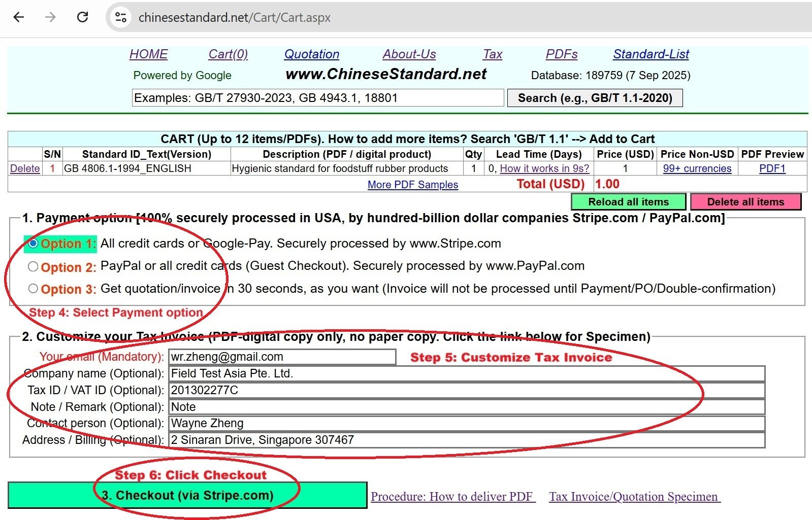 How to buy and download a true PDF of English version of GB/T 5169.10-2017?A step-by-step guide to download PDF of GB/T 5169.10-2017_EnglishStep 1: Visit website https://www.ChineseStandard.net (Pay in USD), or https://www.ChineseStandard.us (Pay in any currencies such as Euro, KRW, JPY, AUD). Step 2: Search keyword "GB/T 5169.10-2017". Step 3: Click "Add to Cart". If multiple PDFs are required, repeat steps 2 and 3 to add up to 12 PDFs to cart. Step 4: Select payment option (Via payment agents Stripe or PayPal). Step 5: Customize Tax Invoice -- Fill up your email etc. Step 6: Click "Checkout". Step 7: Make payment by credit card, PayPal, Google Pay etc. After the payment is completed and in 9 seconds, you will receive 2 emails attached with the purchased PDFs and PDF-invoice, respectively. Step 8: Optional -- Go to download PDF. Step 9: Optional -- Click Open/Download PDF to download PDFs and invoice. See screenshots for above steps: Steps 1~3 Steps 4~6 Step 7 Step 8 Step 9