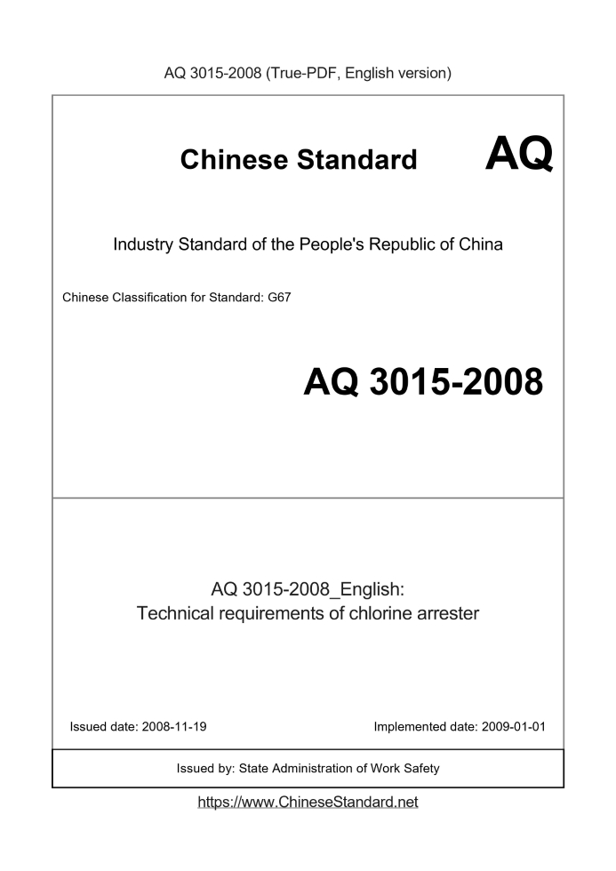 Delivery: <= 3 days. True-PDF full-copy in English will be manually translated and delivered via email. AQ 3015-2008: Technical requirements of chlorine arrester Status: Valid