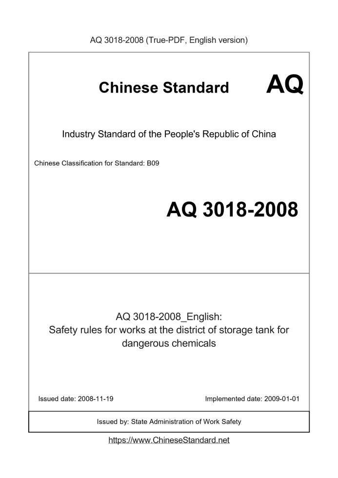 Delivery: <= 3 days. True-PDF full-copy in English will be manually translated and delivered via email. AQ 3018-2008: Safety rules for works at the district of storage tank for dangerous chemicals Status: Valid