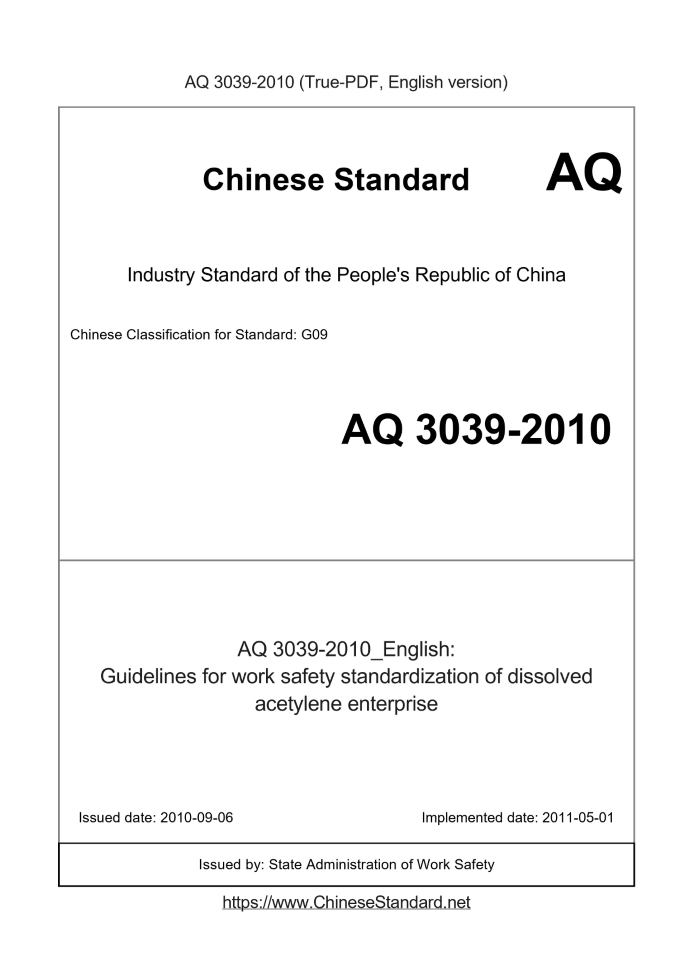 Delivery: <= 3 days. True-PDF full-copy in English will be manually translated and delivered via email. AQ 3039-2010: Guidelines for work safety standardization of dissolved acetylene enterprise Status: Valid