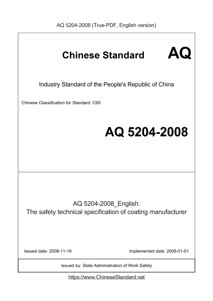 Delivery: <= 5 days. True-PDF full-copy in English will be manually translated and delivered via email. AQ 5204-2008: The safety technical specification of coating manufacturer Status: Valid