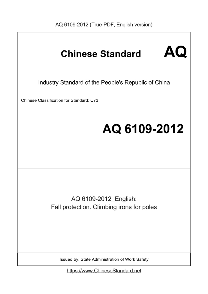 Delivery: <= 3 days. True-PDF full-copy in English will be manually translated and delivered via email. AQ 6109-2012: Fall protection. Climbing irons for poles Status: Valid