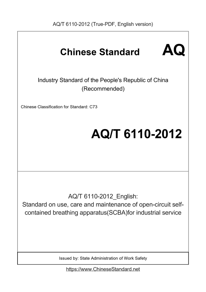 Delivery: <= 4 days. True-PDF full-copy in English will be manually translated and delivered via email. AQ/T 6110-2012: Standard on use, care and maintenance of open-circuit self-contained breathing apparatus(SCBA)for industrial service Status: Valid