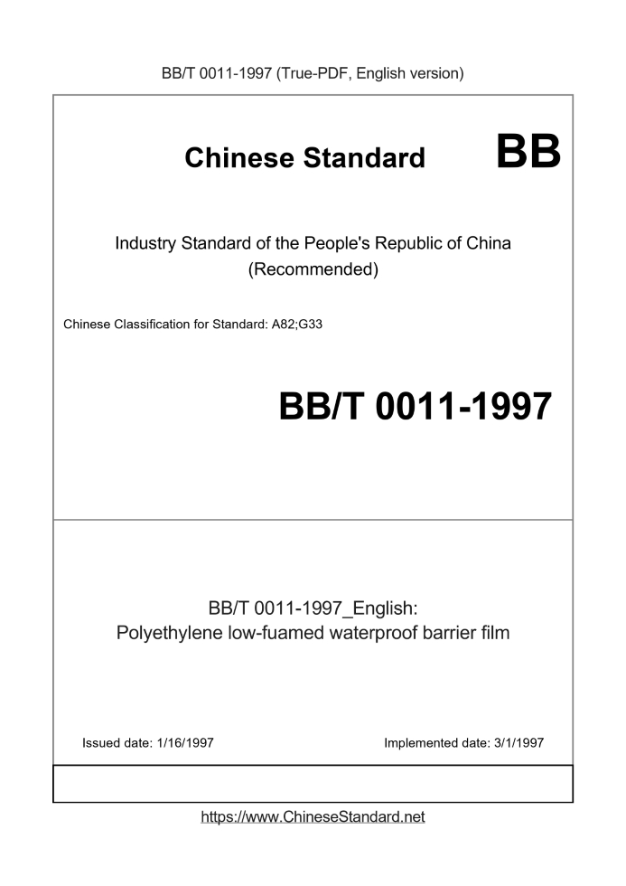 Delivery: <= 3 days. True-PDF full-copy in English will be manually translated and delivered via email. BB/T 0011-1997: Polyethylene low-fuamed waterproof barrier film