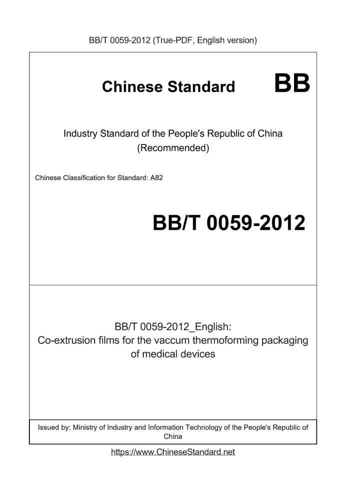 Delivery: <= 3 days. True-PDF full-copy in English will be manually translated and delivered via email. BB/T 0059-2012: Co-extrusion films for the vaccum thermoforming packaging of medical devices Status: Valid