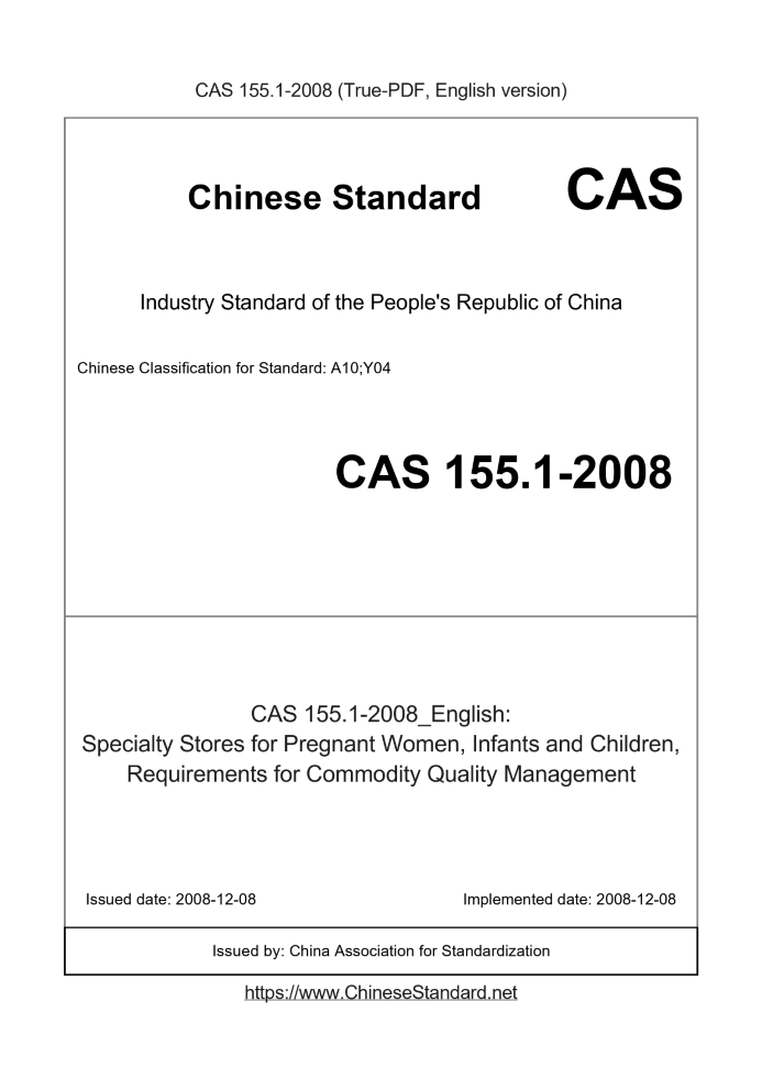 Delivery: <= 5 days. True-PDF full-copy in English will be manually translated and delivered via email. CAS155.1-2008: Specialty Stores for Pregnant Women, Infants and Children, Requirements for Commodity Quality Management Status: Valid CAS155.1: Historical versions