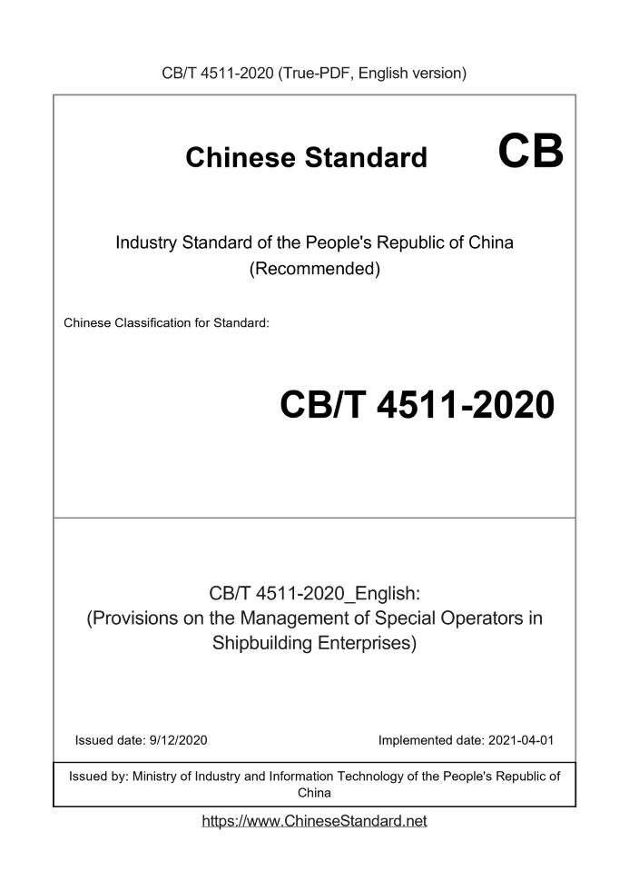| CB/T 4511-2020 | English | RFQ | ASK | 3 days [Need to translate] | (Provisions on the Management of Special Operators in Shipbuilding Enterprises) |