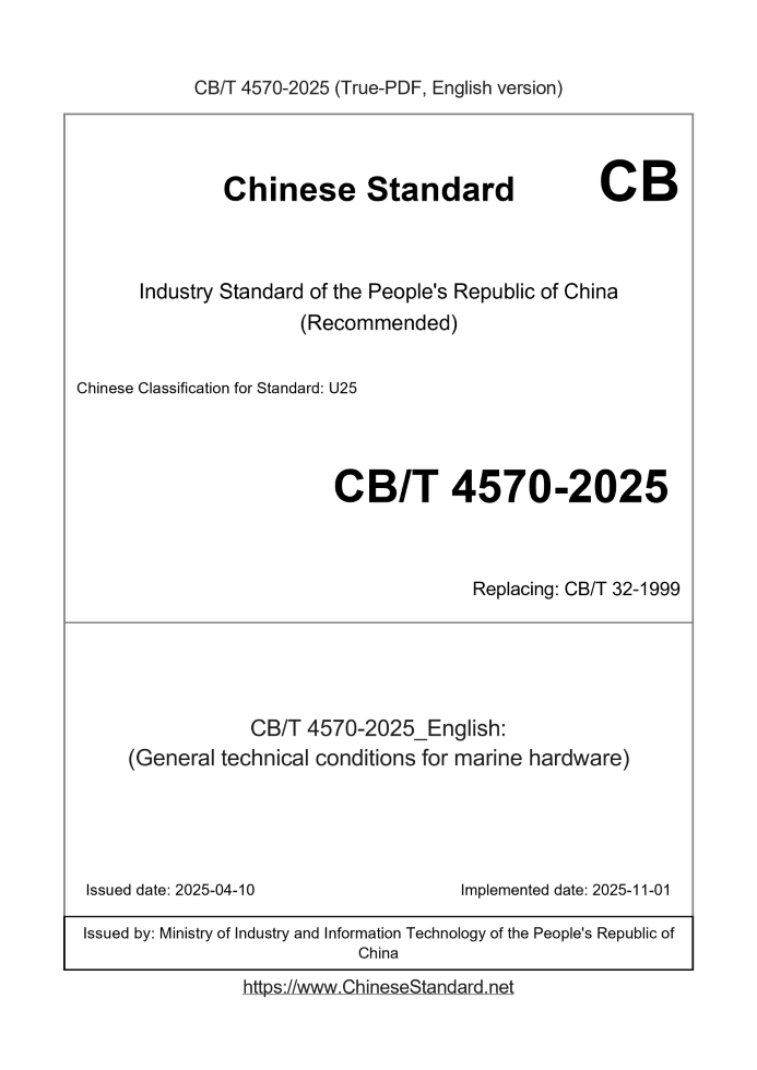 Basic dataStandard ID: CB/T 4570-2025 (CB/T4570-2025)Description (Translated English): (General technical conditions for marine hardware) Sector / Industry: Shipping Industry Standard (Recommended) Classification of Chinese Standard: U25 Classification of International Standard: 47, 47.020, 47.020.50 Date of Issue: 2025-04-10 Date of Implementation: 2025-11-01 Older Standard (superseded by this standard): CB/T 32-1999 Issuing agency(ies): Ministry of Industry and Information Technology of the People's Republic of China Summary: This standard specifies the classification, requirements, inspection rules and marking, packaging and storage of marine hardware. This standard applies to the design, manufacture and acceptance of marine hardware Tips & Frequently Asked Questions:Question 1: How long will the true-PDF of CB/T 4570-2025_English be delivered?Answer: Upon your order, we will start to translate CB/T 4570-2025_English as soon as possible, and keep you informed of the progress. The lead time is typically 1 ~ 3 working days. The lengthier the document the longer the lead time.Question 2: Can I share the purchased PDF of CB/T 4570-2025_English with my colleagues?Answer: Yes. The purchased PDF of CB/T 4570-2025_English will be deemed to be sold to your employer/organization who actually pays for it, including your colleagues and your employer's intranet.Question 3: Does the price include tax/VAT?Answer: Yes. Our tax invoice, downloaded/delivered in 9 seconds, includes all tax/VAT and complies with 100+ countries' tax regulations (tax exempted in 100+ countries) -- See Avoidance of Double Taxation Agreements (DTAs): List of DTAs signed between Singapore and 100+ countriesQuestion 4: Do you accept my currency other than USD?Answer: Yes. If you need your currency to be printed on the invoice, please write an email to Sales@ChineseStandard.net. In 2 working-hours, we will create a special link for you to pay in any currencies. Otherwise, follow the normal steps: Add to Cart -- Checkout -- Select your currency to pay. |