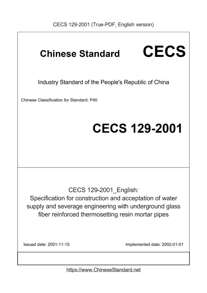 Delivery: <= 5 days. True-PDF full-copy in English will be manually translated and delivered via email. CECS129-2001: Specification for construction and acceptation of water supply and severage engineering with underground glass fiber reinforced thermosetting resin mortar pipes Status: Valid