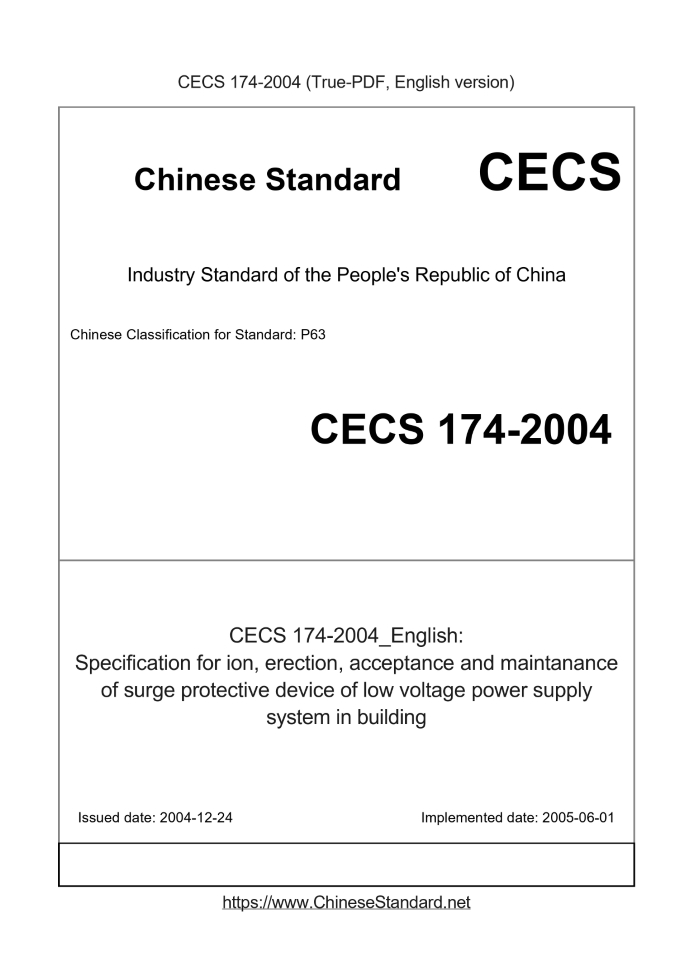 Basic dataStandard ID: CECS 174-2004 (CECS174-2004)Description (Translated English): Specification for ion, erection, acceptance and maintanance of surge protective device of low voltage power supply system in building Sector / Industry: Construction Industry Standard Classification of Chinese Standard: P63 Word Count Estimation: 79,733 Date of Issue: 2004-12-24 Date of Implementation: 2005-06-01 Regulation (derived from): Construction Association (2001) Building Standards Association Zi No. 10 " on the issuance of China Engineering Construction Standardization Association in 2001 the first batch of the standard system, the revised project plan notice" Summary: This standard applies to: Frequency 48 ~ 52Hz, rated voltage 220V/380V power low voltage AC power systems in buildings and their connections electronic equipment. Tips & Frequently Asked Questions:Question 1: How long will the true-PDF of CECS174-2004_English be delivered?Answer: Upon your order, we will start to translate CECS174-2004_English as soon as possible, and keep you informed of the progress. The lead time is typically 6 ~ 10 working days. The lengthier the document the longer the lead time.Question 2: Can I share the purchased PDF of CECS174-2004_English with my colleagues?Answer: Yes. The purchased PDF of CECS174-2004_English will be deemed to be sold to your employer/organization who actually pays for it, including your colleagues and your employer's intranet.Question 3: Does the price include tax/VAT?Answer: Yes. Our tax invoice, downloaded/delivered in 9 seconds, includes all tax/VAT and complies with 100+ countries' tax regulations (tax exempted in 100+ countries) -- See Avoidance of Double Taxation Agreements (DTAs): List of DTAs signed between Singapore and 100+ countriesQuestion 4: Do you accept my currency other than USD?Answer: Yes. If you need your currency to be printed on the invoice, please write an email to Sales@ChineseStandard.net. In 2 working-hours, we will create a special link for you to pay in any currencies. Otherwise, follow the normal steps: Add to Cart -- Checkout -- Select your currency to pay. |