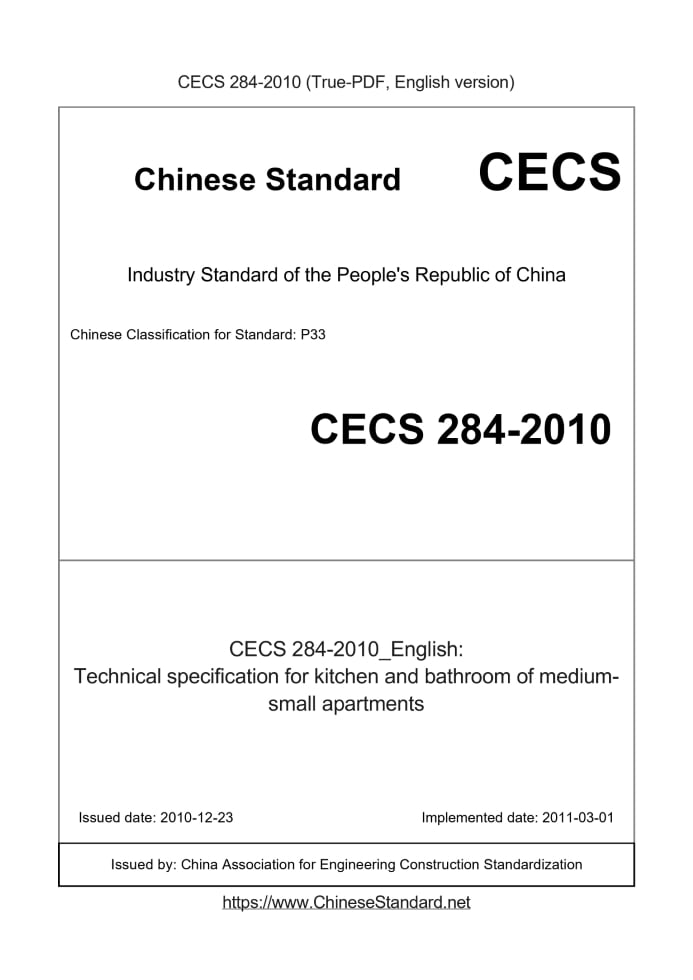 Delivery: <= 7 days. True-PDF full-copy in English will be manually translated and delivered via email. CECS284-2010: Technical specification for kitchen and bathroom of medium-small apartments Status: Valid