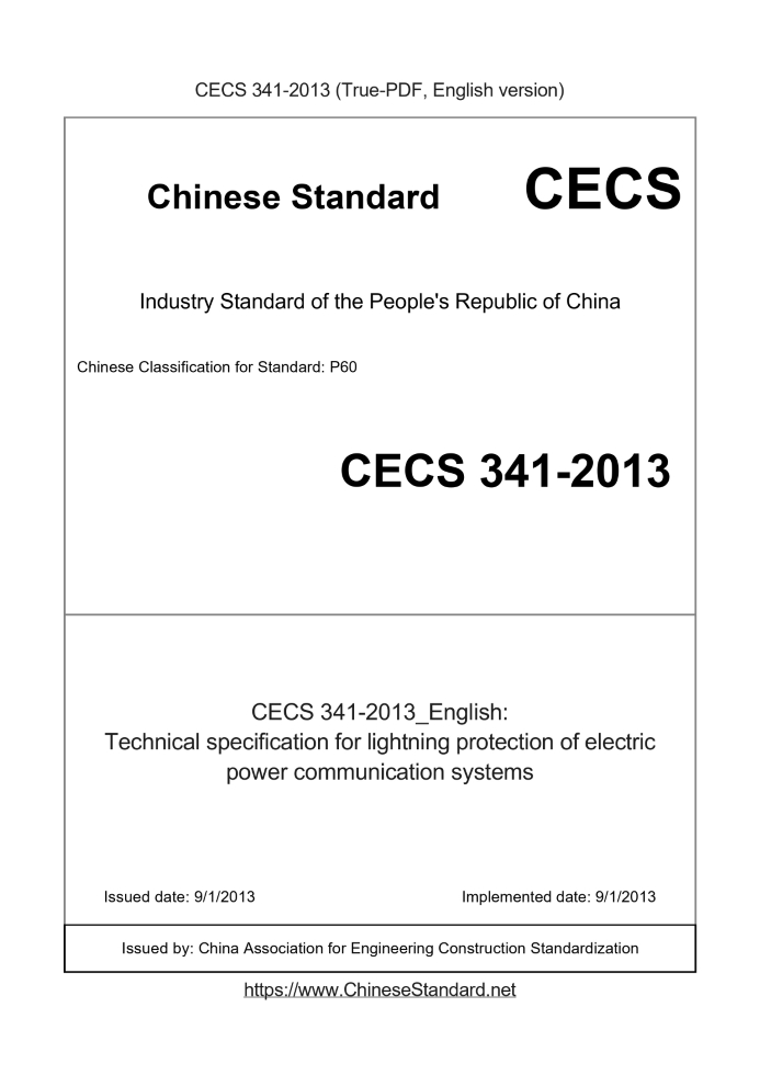 Delivery: <= 6 days. True-PDF full-copy in English will be manually translated and delivered via email. CECS341-2013: Technical specification for lightning protection of electric power communication systems Status: Valid