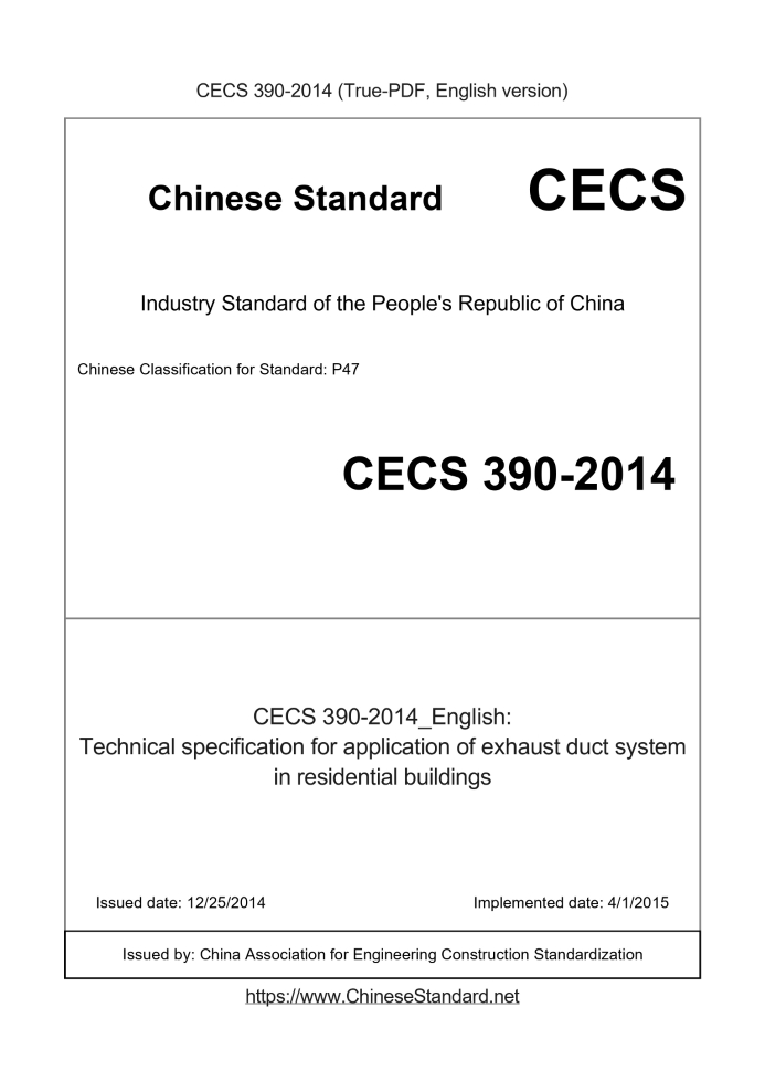 Delivery: <= 5 days. True-PDF full-copy in English will be manually translated and delivered via email. CECS390-2014: Technical specification for application of exhaust duct system in residential buildings Status: Valid