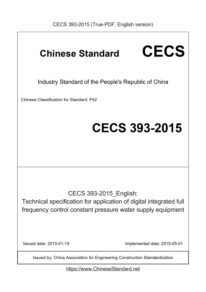 Basic dataStandard ID: CECS 393-2015 (CECS393-2015)Description (Translated English): Technical specification for application of digital integrated full frequency control constant pressure water supply equipment Sector / Industry: Construction Industry Standard Classification of Chinese Standard: P42 Classification of International Standard: 91.140.60 Word Count Estimation: 116,114 Date of Issue: 2015-01-19 Date of Implementation: 2015-05-01 Quoted Standard: GB 50015; GB 50052; GB 50054; GB 50055; GB 50150; GB 50217; GB 50231; GB 50242; GB 50303; GB 50343; GB/T 3797; GB 4208; GB 5749; GB 12668.3; GB/T 14549; GB/T 16895.15; GB 18613 Regulation (derived from): China Engineering Construction Standardization Association Notice No. 189 Issuing agency(ies): China Association for Engineering Construction Standardization Summary: This Standard applies to new construction, expansion and renovation of civil and industrial buildings domestic water supply project in the secondary digital integrated full frequency control water supply equipment system design, construction, installation, commissioning and acceptance and maintenance management. Building air conditioning circulating water, building water, urban and rural water supply, industrial and mining production water and other projects when using digital integrated full frequency control water supply equipment, according to need and according to the standards implemented. Tips & Frequently Asked Questions:Question 1: How long will the true-PDF of CECS393-2015_English be delivered?Answer: Upon your order, we will start to translate CECS393-2015_English as soon as possible, and keep you informed of the progress. The lead time is typically 1 ~ 3 working days. The lengthier the document the longer the lead time.Question 2: Can I share the purchased PDF of CECS393-2015_English with my colleagues?Answer: Yes. The purchased PDF of CECS393-2015_English will be deemed to be sold to your employer/organization who actually pays for it, including your colleagues and your employer's intranet.Question 3: Does the price include tax/VAT?Answer: Yes. Our tax invoice, downloaded/delivered in 9 seconds, includes all tax/VAT and complies with 100+ countries' tax regulations (tax exempted in 100+ countries) -- See Avoidance of Double Taxation Agreements (DTAs): List of DTAs signed between Singapore and 100+ countriesQuestion 4: Do you accept my currency other than USD?Answer: Yes. If you need your currency to be printed on the invoice, please write an email to Sales@ChineseStandard.net. In 2 working-hours, we will create a special link for you to pay in any currencies. Otherwise, follow the normal steps: Add to Cart -- Checkout -- Select your currency to pay. |
