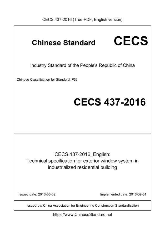 Delivery: <= 10 days. True-PDF full-copy in English will be manually translated and delivered via email. CECS437-2016: Technical specification for exterior window system in industrialized residential building Status: Valid