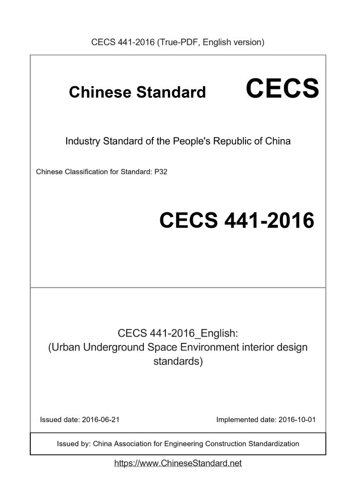 Delivery: <= 6 days. True-PDF full-copy in English will be manually translated and delivered via email. CECS441-2016: (Urban Underground Space Environment interior design standards) Status: Valid