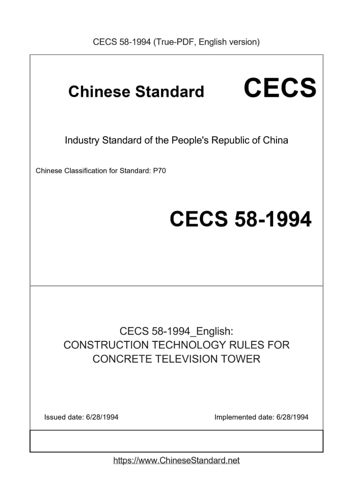 Basic dataStandard ID: CECS 58-1994 (CECS58-1994)Description (Translated English): CONSTRUCTION TECHNOLOGY RULES FOR CONCRETE TELEVISION TOWER Sector / Industry: Construction Industry Standard Classification of Chinese Standard: P70 Word Count Estimation: 41,446 Date of Issue: 6/28/1994 Date of Implementation: 6/28/1994 Regulation (derived from): Construction-Standard-Association-Letter [2016] No. 107 Summary: This standard applies to a height of 450m below the concrete tower construction. This standard does not involve issues related to the construction must still comply with existing regulations and the relevant regulations. Tips & Frequently Asked Questions:Question 1: How long will the true-PDF of CECS58-1994_English be delivered?Answer: Upon your order, we will start to translate CECS58-1994_English as soon as possible, and keep you informed of the progress. The lead time is typically 4 ~ 7 working days. The lengthier the document the longer the lead time.Question 2: Can I share the purchased PDF of CECS58-1994_English with my colleagues?Answer: Yes. The purchased PDF of CECS58-1994_English will be deemed to be sold to your employer/organization who actually pays for it, including your colleagues and your employer's intranet.Question 3: Does the price include tax/VAT?Answer: Yes. Our tax invoice, downloaded/delivered in 9 seconds, includes all tax/VAT and complies with 100+ countries' tax regulations (tax exempted in 100+ countries) -- See Avoidance of Double Taxation Agreements (DTAs): List of DTAs signed between Singapore and 100+ countriesQuestion 4: Do you accept my currency other than USD?Answer: Yes. If you need your currency to be printed on the invoice, please write an email to Sales@ChineseStandard.net. In 2 working-hours, we will create a special link for you to pay in any currencies. Otherwise, follow the normal steps: Add to Cart -- Checkout -- Select your currency to pay. |