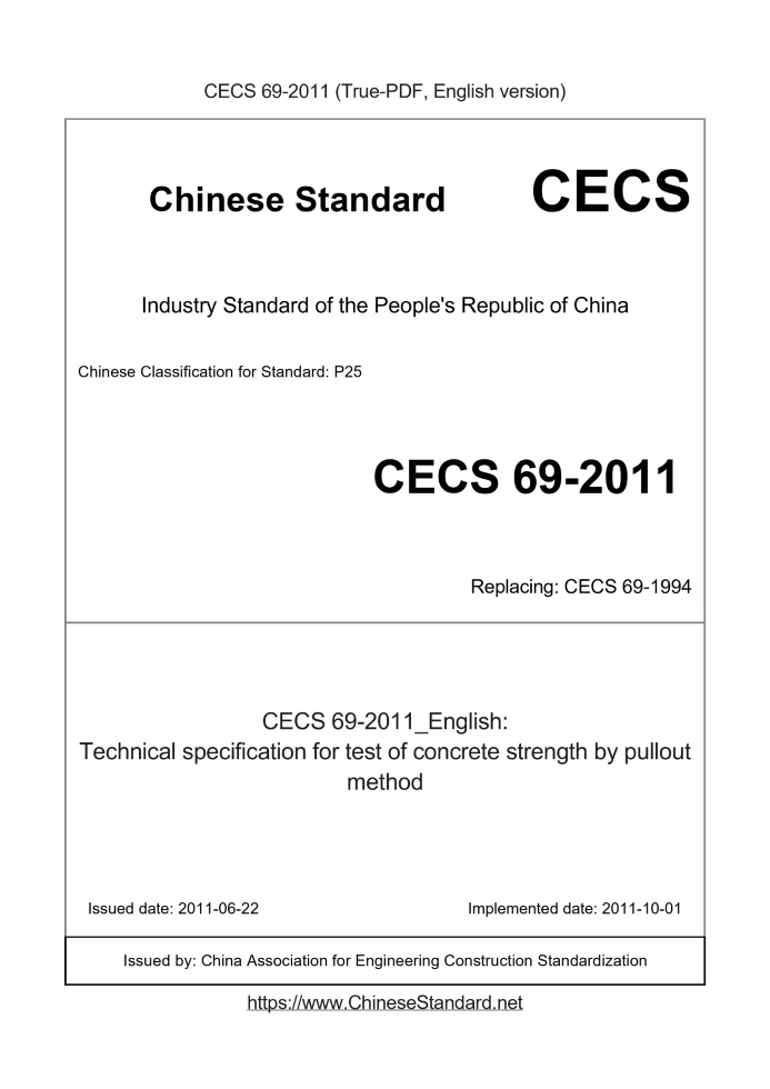 Delivery: <= 7 days. True-PDF full-copy in English will be manually translated and delivered via email. CECS69-2011: Technical specification for test of concrete strength by pullout method Status: Valid CECS69: Historical versions