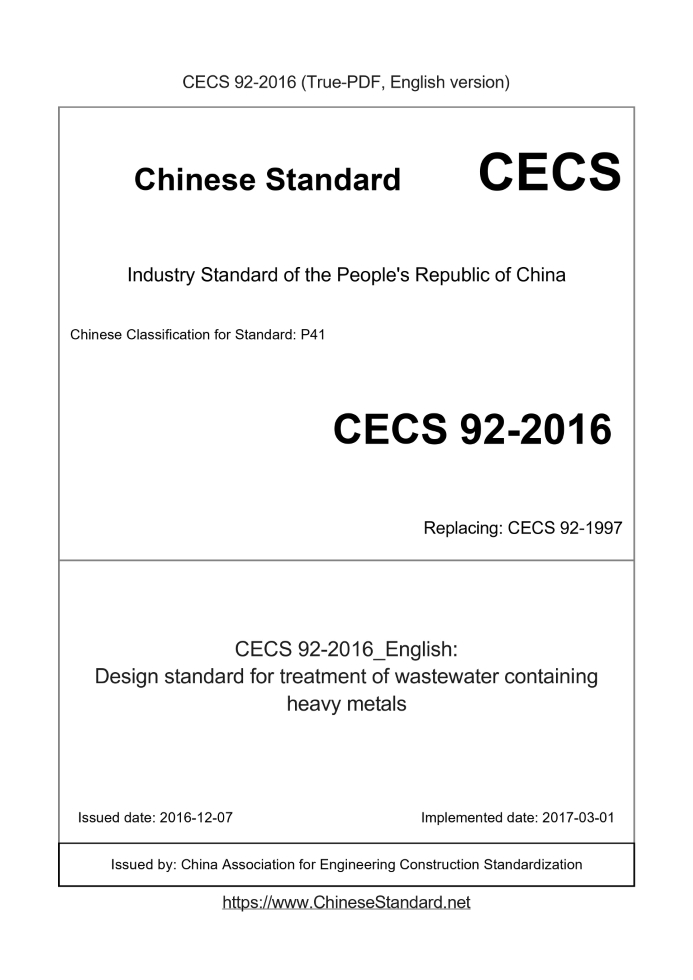Basic dataStandard ID: CECS 92-2016 (CECS92-2016)Description (Translated English): Design standard for treatment of wastewater containing heavy metals Sector / Industry: Construction Industry Standard Classification of Chinese Standard: P41 Classification of International Standard: 91.140.80 Word Count Estimation: 107,120 Date of Issue: 2016-12-07 Date of Implementation: 2017-03-01 Older Standard (superseded by this standard): CECS 92-1997 Quoted Standard: GB 50013; GB 50014; GB 50187; GB 5085.7; GB 18597; GB 18598; GB 18599; HJ 579 Regulation (derived from): Project Construction Standardization Association Notice No.269 of 2016 Issuing agency(ies): China Association for Engineering Construction Standardization Summary: This standard applies to heavy non-ferrous metal mining, heavy non-ferrous metal smelting, lead-acid battery manufacturing, leather and its products, chemical raw materials and chemical products manufacturing industries dealing with heavy metal industrial wastewater engineering design. Tips & Frequently Asked Questions:Question 1: How long will the true-PDF of CECS92-2016_English be delivered?Answer: Upon your order, we will start to translate CECS92-2016_English as soon as possible, and keep you informed of the progress. The lead time is typically 9 ~ 13 working days. The lengthier the document the longer the lead time.Question 2: Can I share the purchased PDF of CECS92-2016_English with my colleagues?Answer: Yes. The purchased PDF of CECS92-2016_English will be deemed to be sold to your employer/organization who actually pays for it, including your colleagues and your employer's intranet.Question 3: Does the price include tax/VAT?Answer: Yes. Our tax invoice, downloaded/delivered in 9 seconds, includes all tax/VAT and complies with 100+ countries' tax regulations (tax exempted in 100+ countries) -- See Avoidance of Double Taxation Agreements (DTAs): List of DTAs signed between Singapore and 100+ countriesQuestion 4: Do you accept my currency other than USD?Answer: Yes. If you need your currency to be printed on the invoice, please write an email to Sales@ChineseStandard.net. In 2 working-hours, we will create a special link for you to pay in any currencies. Otherwise, follow the normal steps: Add to Cart -- Checkout -- Select your currency to pay.Question 5: Should I purchase the latest version CECS92-2016?Answer: Yes. Unless special scenarios such as technical constraints or academic study, you should always prioritize to purchase the latest version CECS92-2016 even if the enforcement date is in future. Complying with the latest version means that, by default, it also complies with all the earlier versions, technically. |
