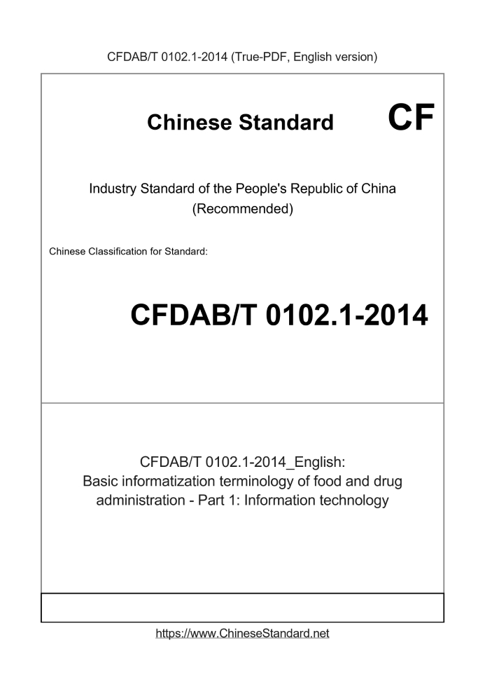 Delivery: <= 5 days. True-PDF full-copy in English will be manually translated and delivered via email. CFDABT0102.1-2014: Basic informatization terminology of food and drug administration - Part 1: Information technology Status: Valid