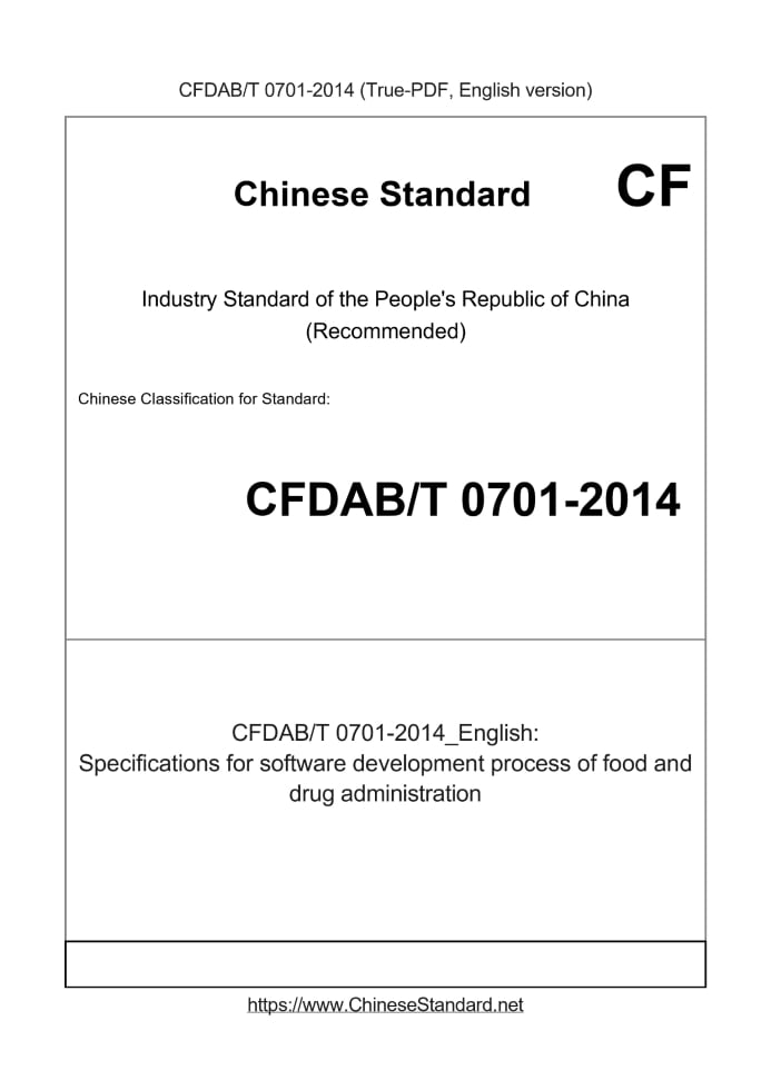 Delivery: <= 5 days. True-PDF full-copy in English will be manually translated and delivered via email. CFDABT0701-2014: Specifications for software development process of food and drug administration Status: Valid