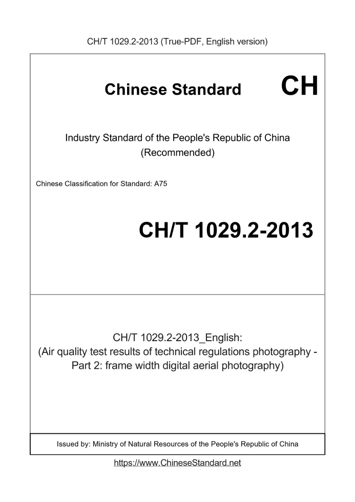 Delivery: <= 4 days. True-PDF full-copy in English will be manually translated and delivered via email. CHT1029.2-2013: (Air quality test results of technical regulations photography - Part 2: frame width digital aerial photography) Status: Valid