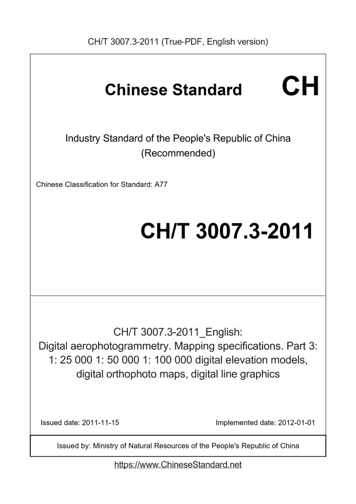 Delivery: <= 4 days. True-PDF full-copy in English will be manually translated and delivered via email. CHT3007.3-2011: Digital aerophotogrammetry. Mapping specifications. Part 3: 1: 25 000 1: 50 000 1: 100 000 digital elevation models, digital orthophoto maps, digital line graphics Status: Valid