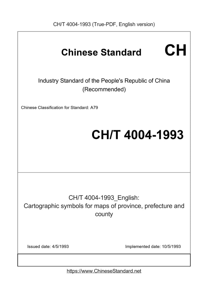 Delivery: <= 7 days. True-PDF full-copy in English will be manually translated and delivered via email. CHT4004-1993: Cartographic symbols for maps of province, prefecture and county