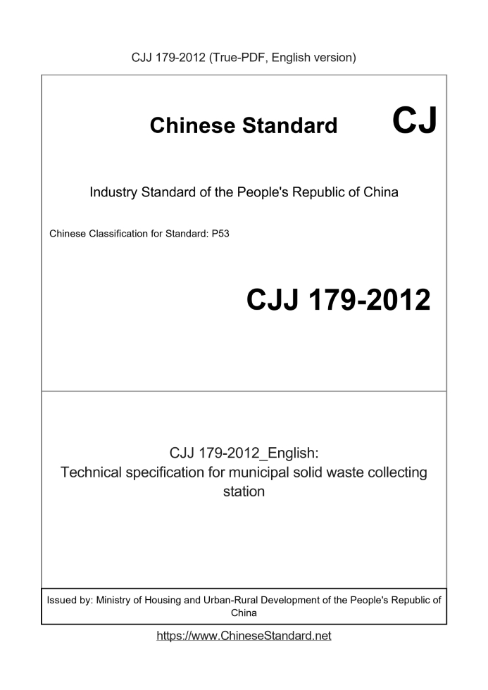Delivery: <= 7 days. True-PDF full-copy in English will be manually translated and delivered via email. CJJ 179-2012: Technical specification for municipal solid waste collecting station Status: Valid