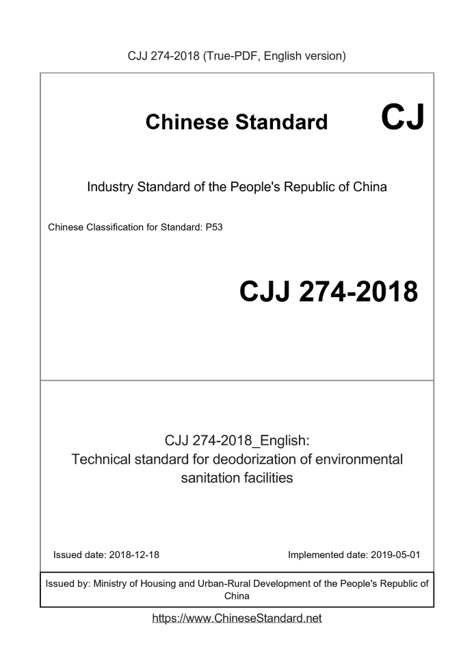 Delivery: <= 8 days. True-PDF full-copy in English will be manually translated and delivered via email. CJJ 274-2018: Technical standard for deodorization of environmental sanitation facilities Status: Valid
