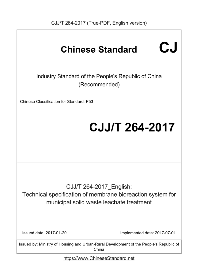 Delivery: <= 5 days. True-PDF full-copy in English will be manually translated and delivered via email. CJJT264-2017: Technical specification of membrane bioreaction system for municipal solid waste leachate treatment Status: Valid