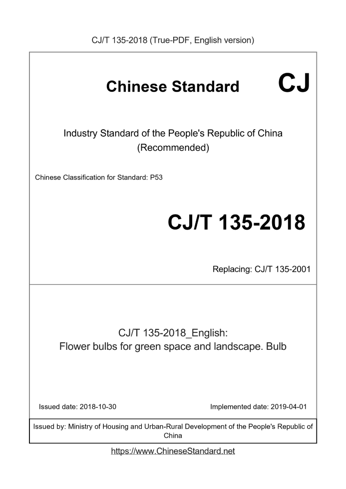 Delivery: <= 3 days. True-PDF full-copy in English will be manually translated and delivered via email. CJ/T 135-2018: Flower bulbs for green space and landscape. Bulb Status: Valid CJ/T 135: Historical versions