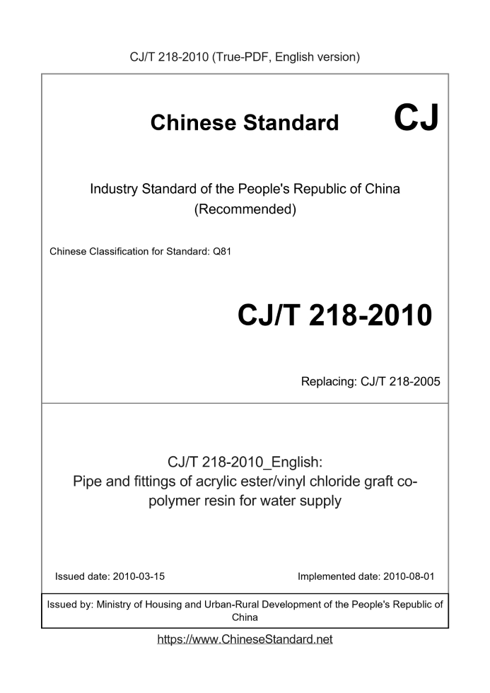 | CJ/T 218-2010 English PDFUS$549.00 · In stock Delivery: <= 4 days. True-PDF full-copy in English will be manually translated and delivered via email. CJ/T 218-2010: Pipe and fittings of acrylic ester/vinyl chloride graft co-polymer resin for water supply Status: Valid CJ/T 218: Historical versions