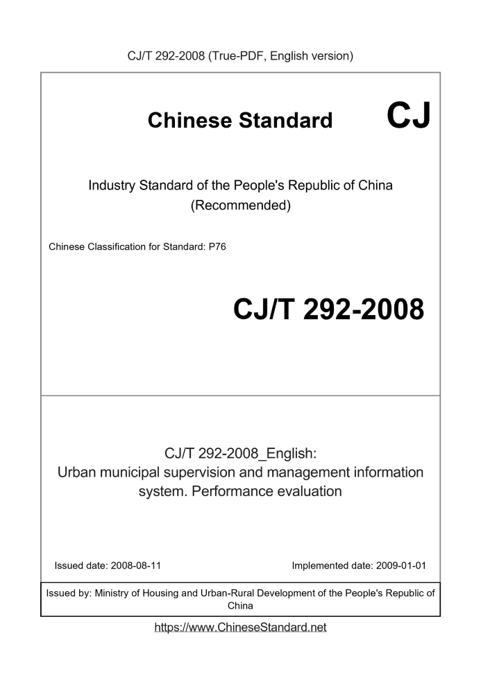 Delivery: <= 3 days. True-PDF full-copy in English will be manually translated and delivered via email. CJ/T 292-2008: Urban municipal supervision and management information system. Performance evaluation Status: Valid