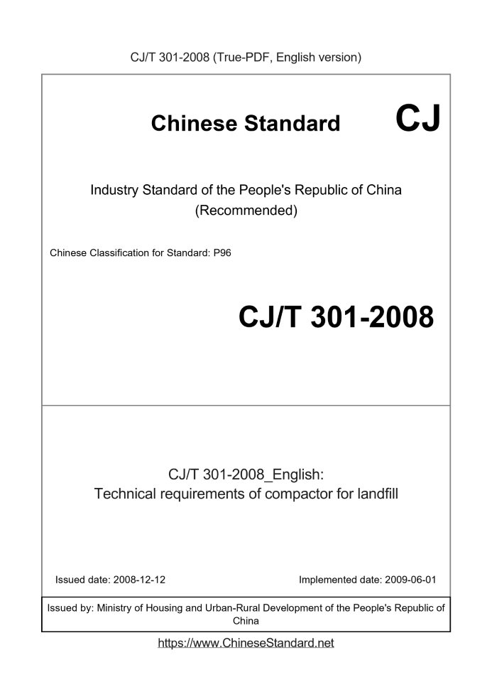 Delivery: <= 5 days. True-PDF full-copy in English will be manually translated and delivered via email. CJ/T 301-2008: Technical requirements of compactor for landfill Status: Valid