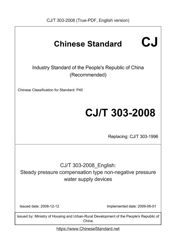 Delivery: <= 3 days. True-PDF full-copy in English will be manually translated and delivered via email. CJ/T 303-2008: Steady pressure compensation type non-negative pressure water supply devices Status: Valid CJ/T 303: Historical versions