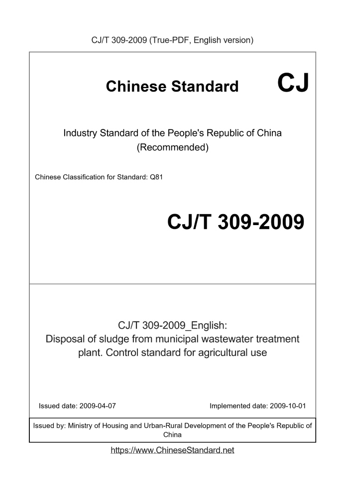 Delivery: <= 3 days. True-PDF full-copy in English will be manually translated and delivered via email. CJ/T 309-2009: Disposal of sludge from municipal wastewater treatment plant. Control standard for agricultural use Status: Valid