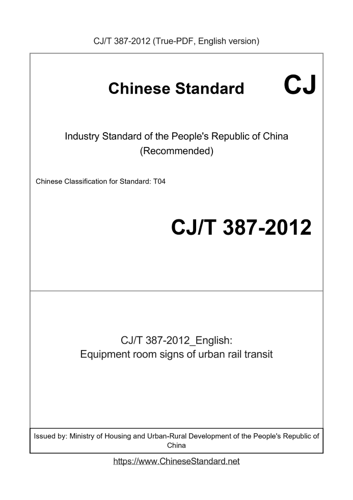 Delivery: <= 3 days. True-PDF full-copy in English will be manually translated and delivered via email. CJ/T 387-2012: Equipment room signs of urban rail transit Status: Valid